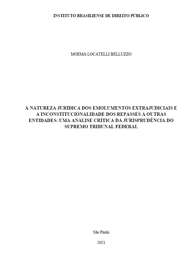 A Tabeliã e Registradora do Cartório do 2º Ofício de Monte Alegre/PA, Moema Locatelli Belluzzo, defendeu, em 26/03/2021, a Dissertação de Mestrado intitulada “A natureza jurídica dos emolumentos extrajudiciais e a inconstitucionalidade dos repasses a outras entidades: uma análise crítica da jurisprudência do Supremo Tribunal Federal” apresentada ao Instituto Brasiliense de Direito Público (IDP) para a obtenção de título em Mestre em Direito, Justiça e Desenvolvimento. Compôs a Banca Examinadora os Professores Doutores Ricardo Geraldo Rezende Silveira, Rafael Silveira e Silva e Marcel Edvar Simões.