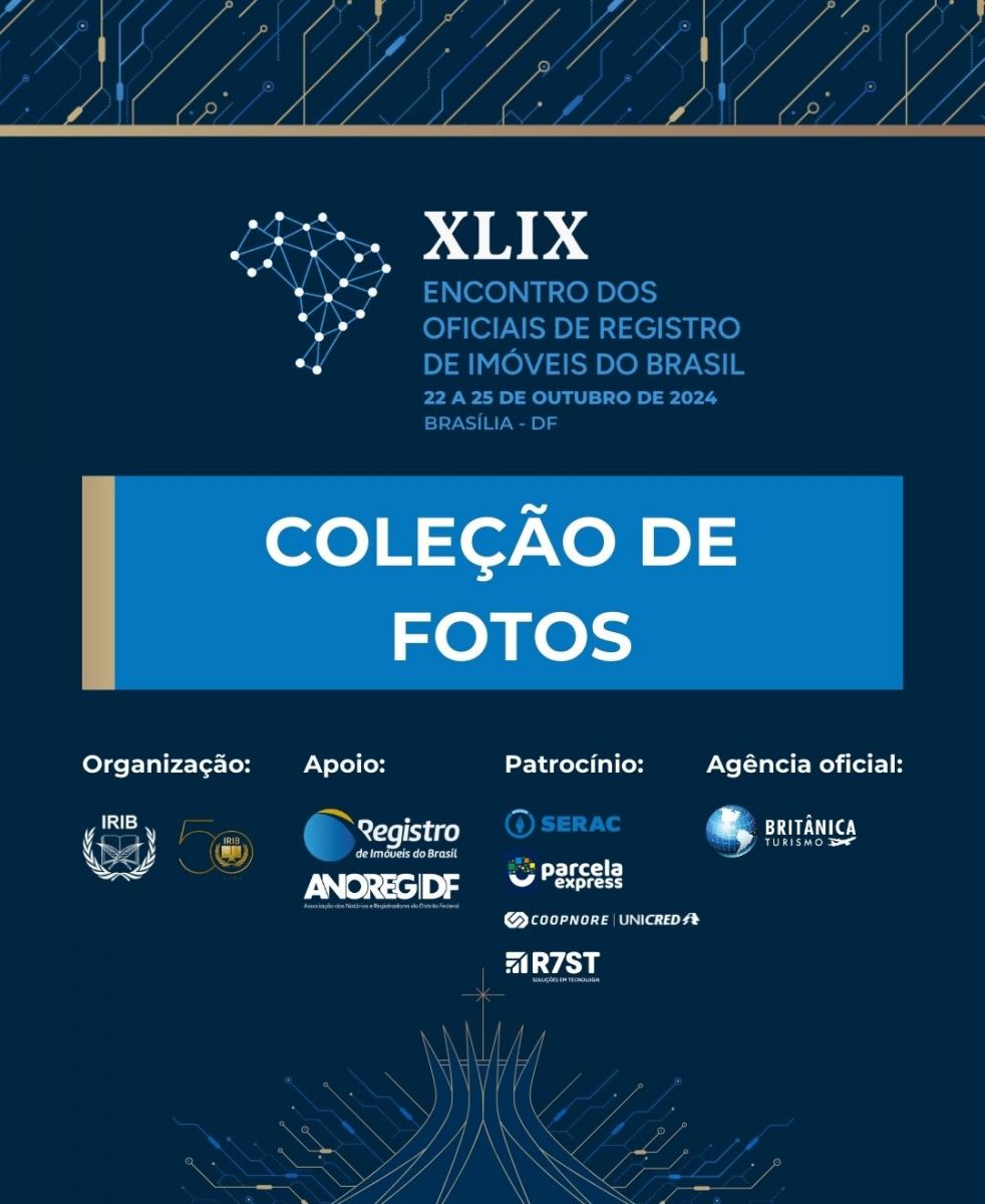 O Instituto de Registro Imobiliário do Brasil (IRIB) informa que disponibilizou em seu Flickr a coleção de fotos do XLIX Encontro dos Oficiais de Registro de Imóveis do Brasil, realizado entre os dias 22 e 25 de outubro, no Royal Tulip Brasília Alvorada, em Brasília/DF. O evento, além de comemorar o 50º aniversário do IRIB, promoveu a atualização profissional e a troca de experiências entre seus participantes, além de marcar um momento histórico para o IRIB, que realizou, pela primeira vez em sua trajetória, a transmissão ao vivo de um evento e exibiu as galerias de Ex-Presidentes e de 50 anos do IRIB.