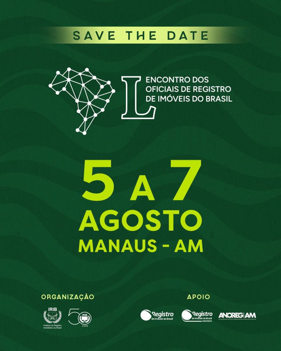 O Instituto de Registro Imobiliário do Brasil (IRIB) informa que já estão abertas as inscrições para o L ENCONTRO DOS OFICIAIS DE REGISTRO DE IMÓVEIS DO BRASIL! O 50º Encontro Nacional do IRIB será realizado entre os dias 5 e 7 de agosto, na cidade de MANAUS/AM, e conta com o apoio do Registro de Imóveis do Brasil (RIB), do Registro de Imóveis do Brasil – Seção Amazonas (RIB-AM) e da Associação dos Notários e Registradores do Estado do Amazonas (ANOREG-AM).