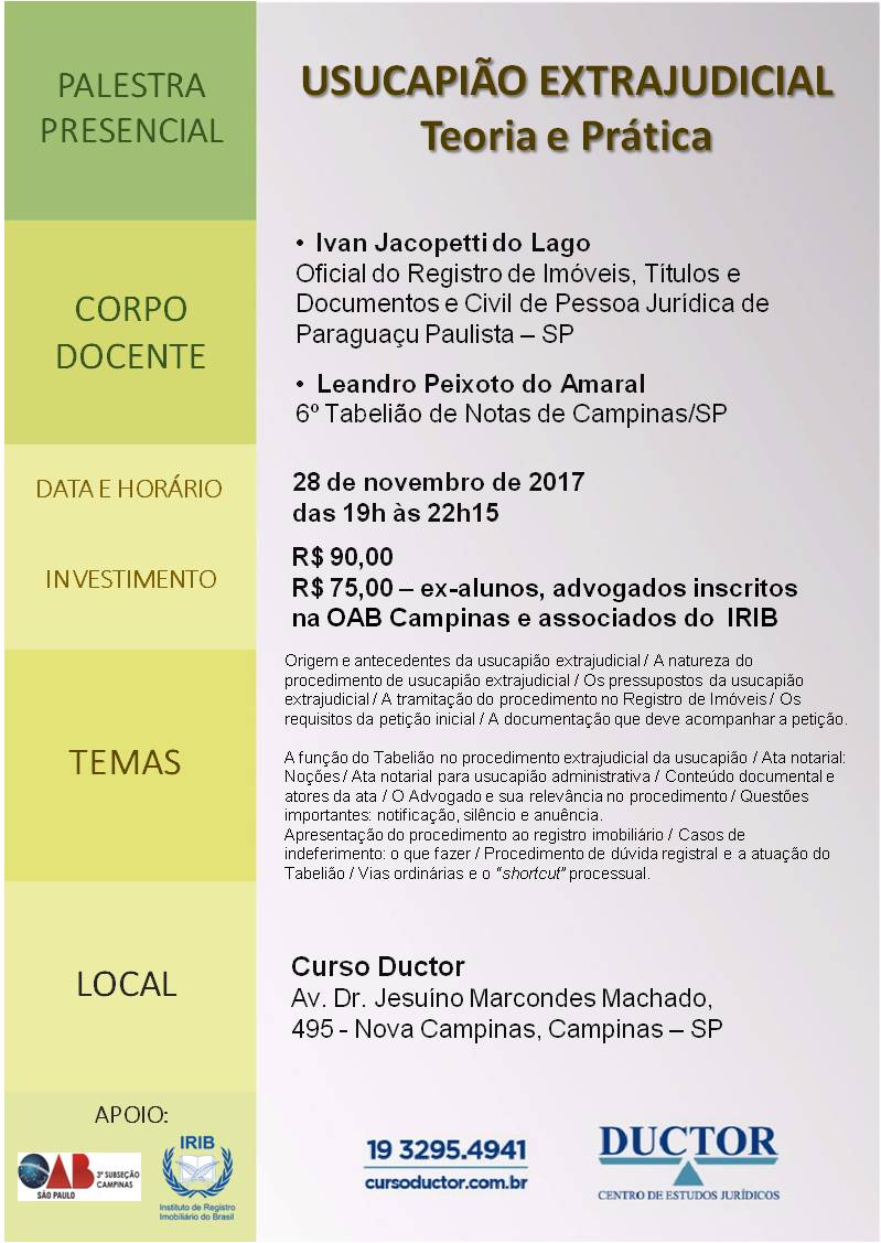 O Centro de Estudos Jurídicos DUCTOR promoverá o curso “USUCAPIÃO EXTRAJUDICIAL – Teoria e Prática”, ministrado pelos Drs. Ivan Jacopetti do Lago (Diretor de Relações Internacionais do IRIB e Oficial de Registro de Imóveis, Títulos e Documentos e Civil de Pessoa Jurídica de Paraguaçu Paulista/SP) e Leandro Peixoto do Amaral (6º Tabelião de Notas de Campinas/SP).